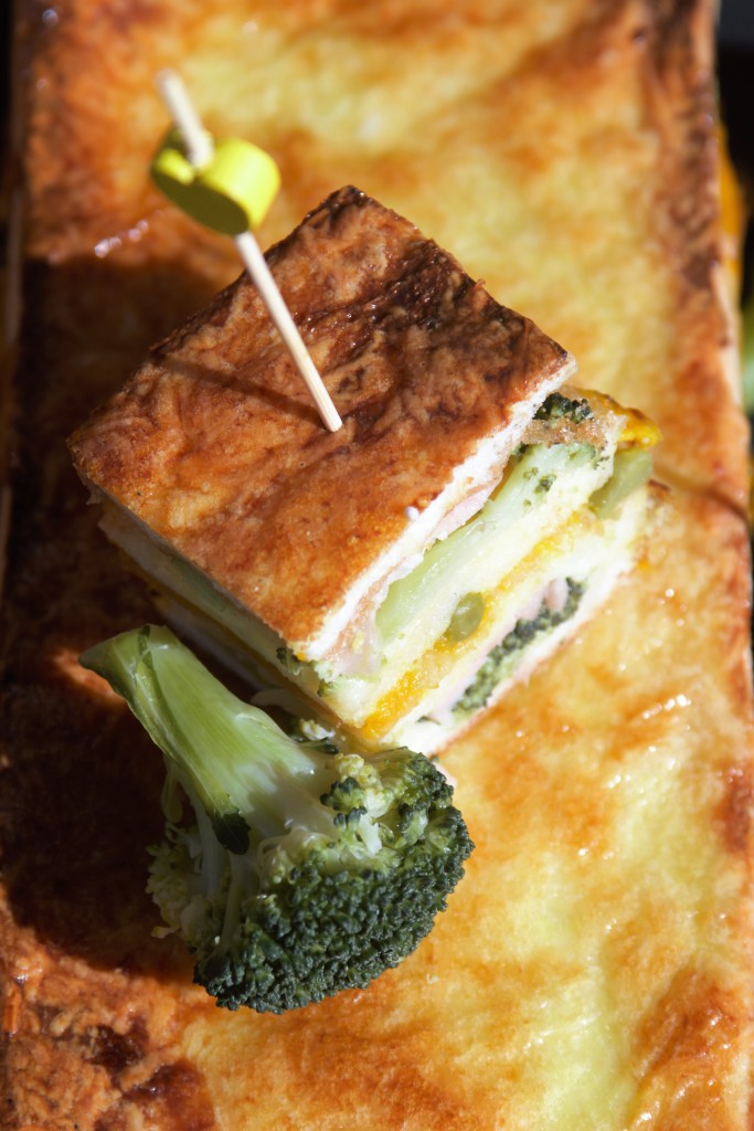 Rivestire con carta forno il fondo e bordi di uno stampo rettangolare da cm. 25×12 circa. Inzuppare, una alla volta, le strisce di pane tostato nella crema di uova, sgocciolare e posizionare una fetta sul fondo dello stampo. Distribuire su di essa uno strato di verdure precedentemente cotte al vapore, cospargere con poco formaggio grattugiato -io in questa versione ho messo anche delle fettine di porchetta ad insaporire i broccoli-. Procedere con la seconda fetta di pane, inzuppando anch’essa e posizionandola sopra i broccoli, esercitando una leggera pressione. Distribuire sopra al pane uno strato di crema di zucca e piselli, ricoprire con la terza fetta inzuppata, altro strato di broccoli e ultimare con la fetta di pane inzuppata. Se avanzasse della crema di uovo versarla sulla superficie della “mattonella” e pressare leggermente. Infornare in forno già alla temperatura di 170°C per 25′ circa. Lasciare intiepidire prima di sformare. Per la versione finger food lasciare raffreddare completamente la mattonella, in frigorifero, prima di porzionarla a piccoli spiedini tenuti insieme da uno stecco di legno.