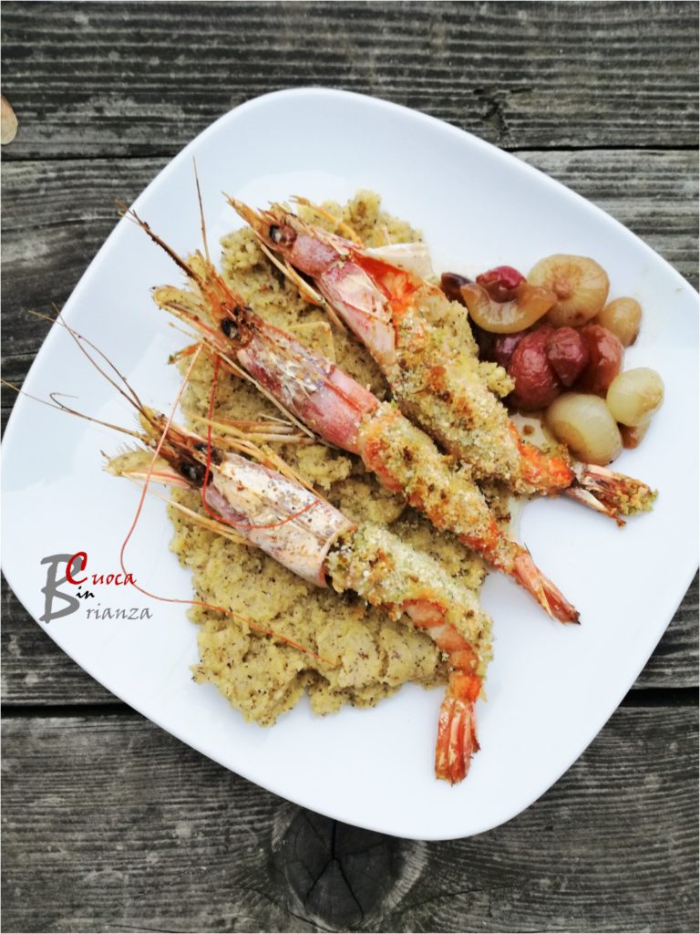 Serviamo i gamberoni adagiandoli sulla polenta taragna – si prepara facendo cuocere per circa 40 minuti la farina in un paio di litri d’acqua salata, utilizzando possibilmente un paiolo in rame con pala motorizzata- Accompagniamo a scelta con verdure – io ho preparato cipolline borretane e rapanelli in agrodolce.